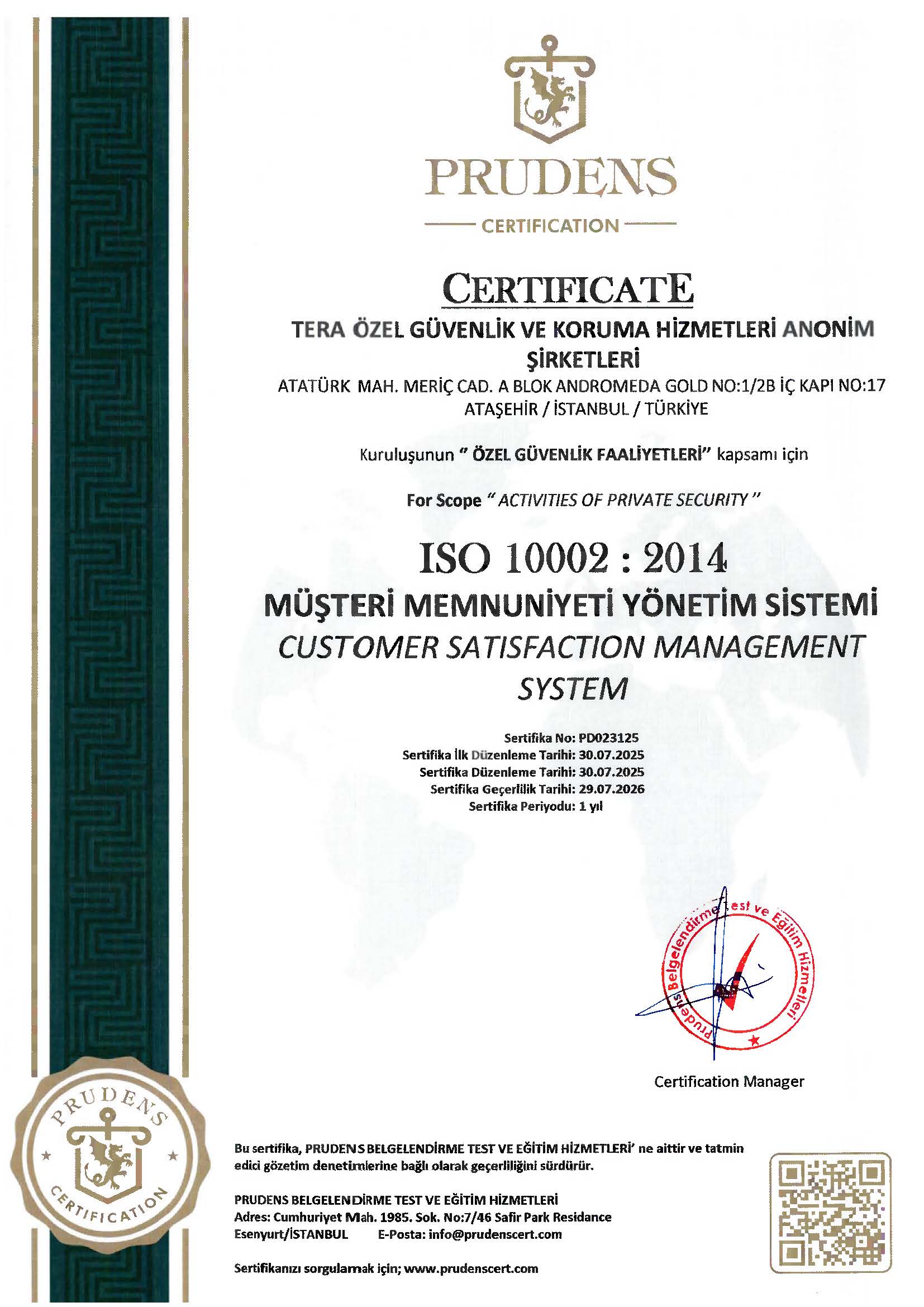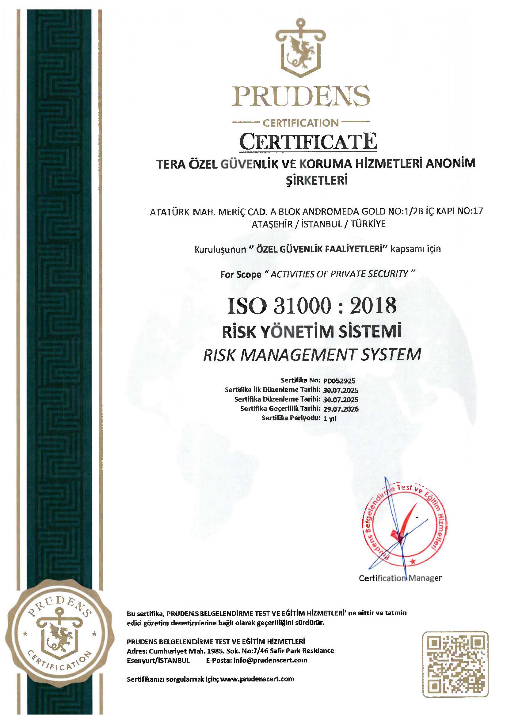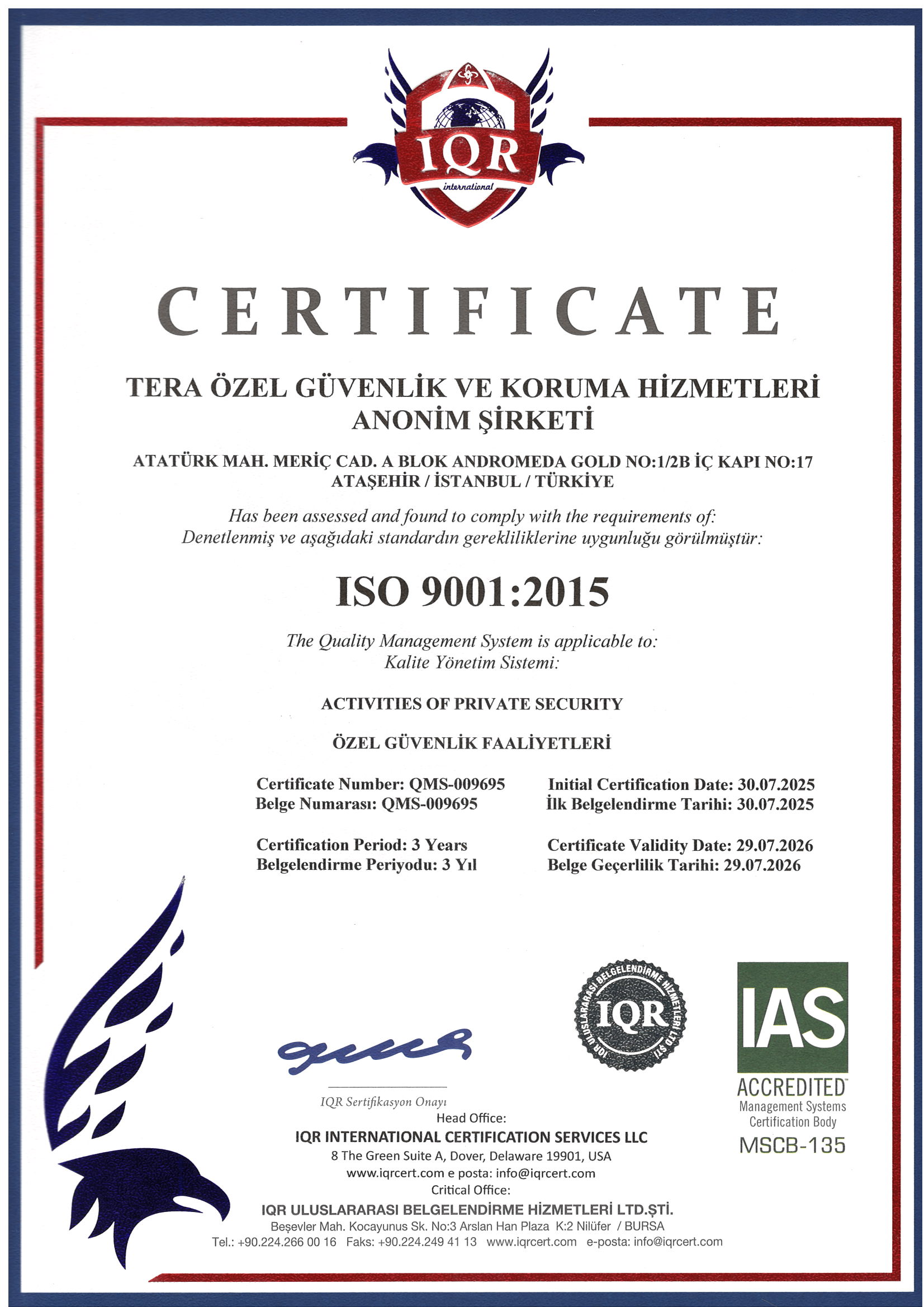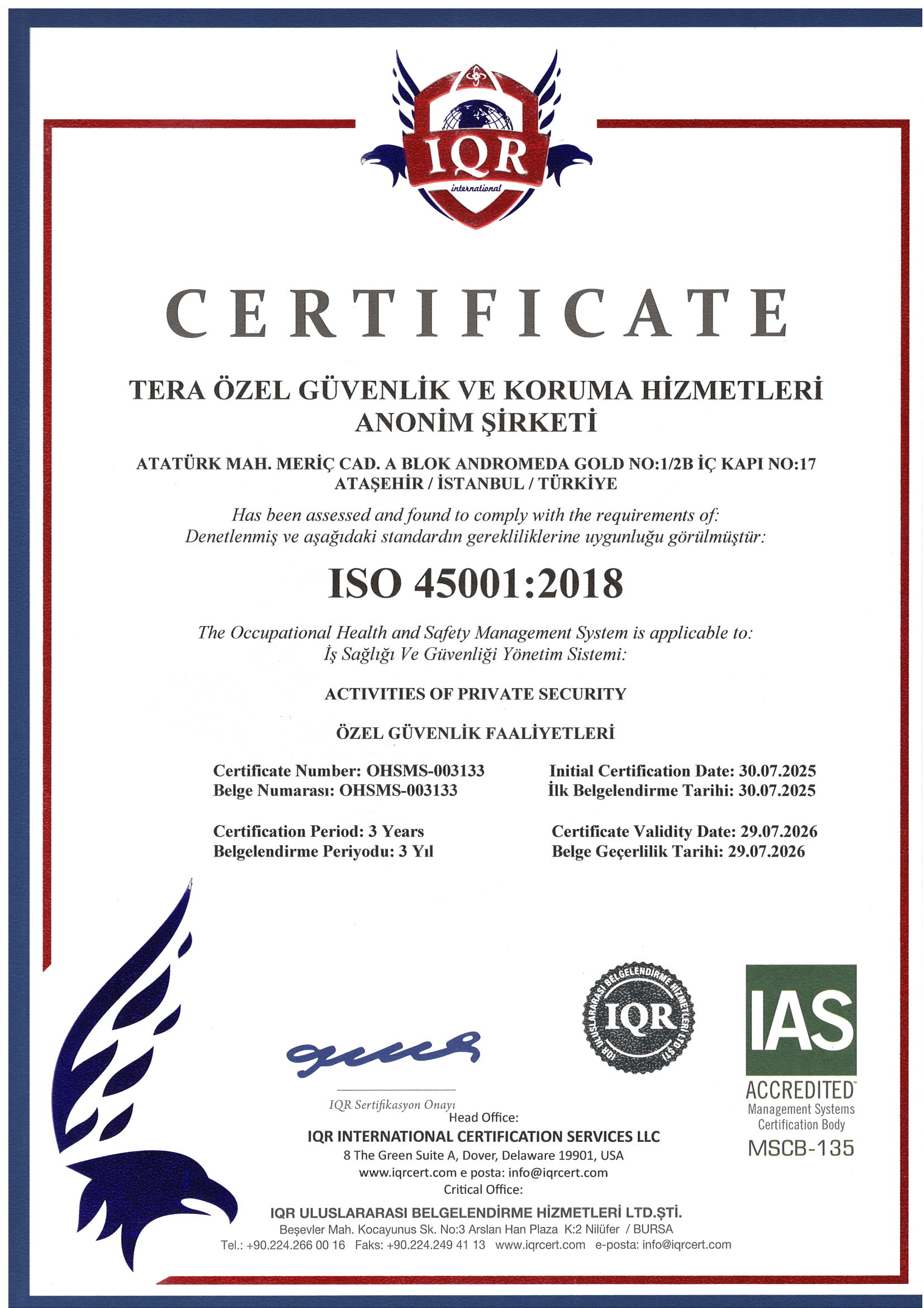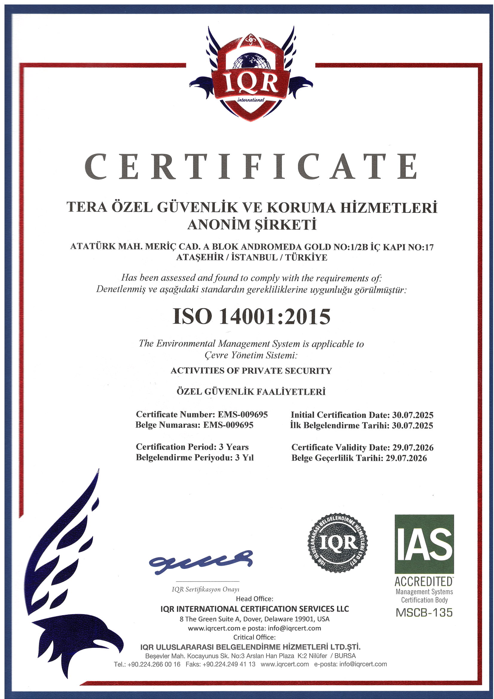 Tera Özel Güvenlik ve Koruma Hizmetleri A.Ş. olarak, sunduğumuz hizmetlerde uluslararası kalite standartlarını benimseyerek faaliyet göstermekteyiz. İş sağlığı ve güvenliğinden çevre yönetimine, müşteri memnuniyetinden risk yönetimine kadar birçok alanda sahip olduğumuz ISO sertifikaları ile güvenilirliğimizi ve profesyonelliğimizi belgeliyoruz.